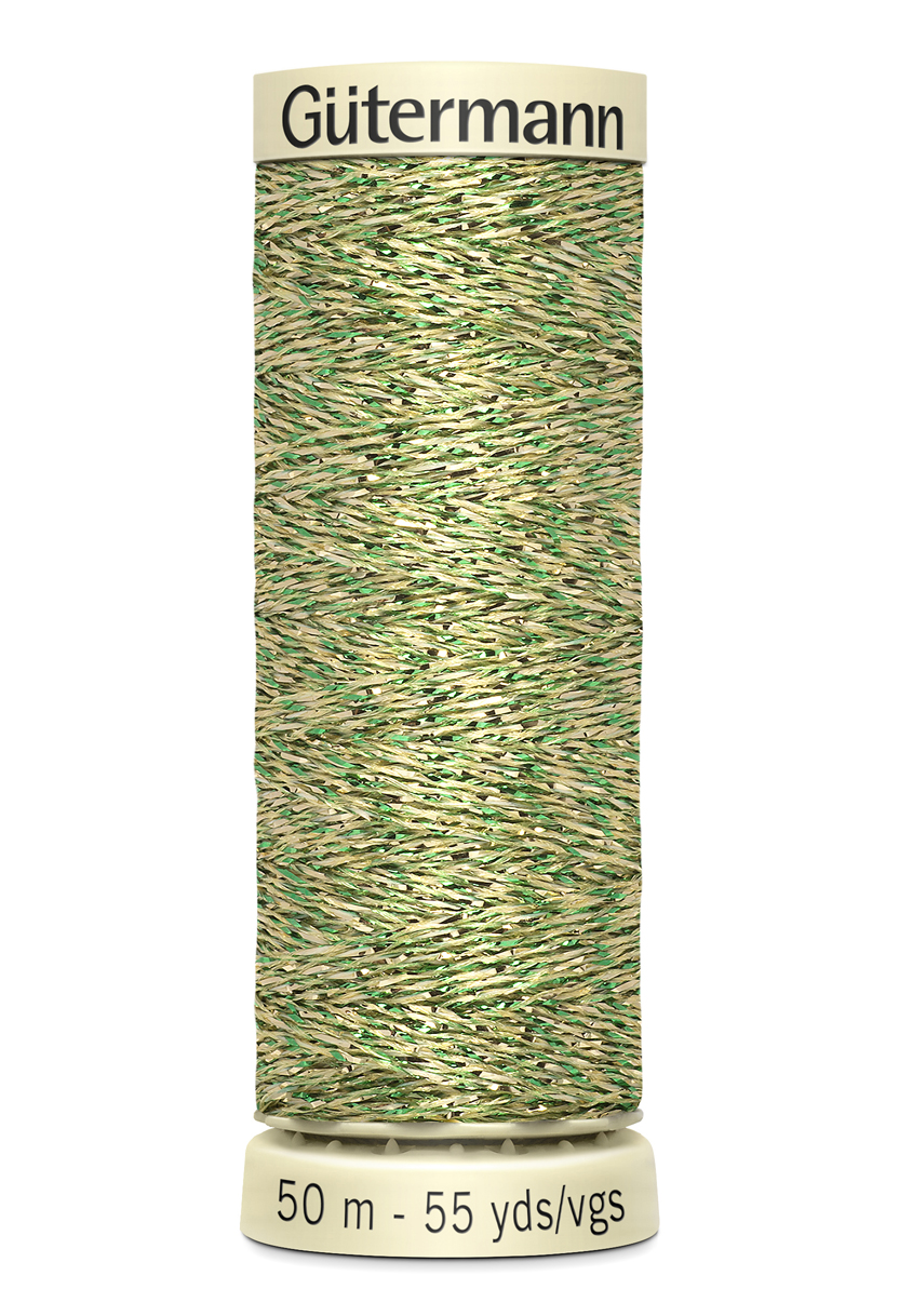 Gutermann metallic thread on 50m bobbins. Great for decorative stitching and machine embroidery. Also for decorative effects in knitwear. For hand and machine sewing. 70% polyamide and 30% polyester. Recommended needle: Universal, size 100 – 110.