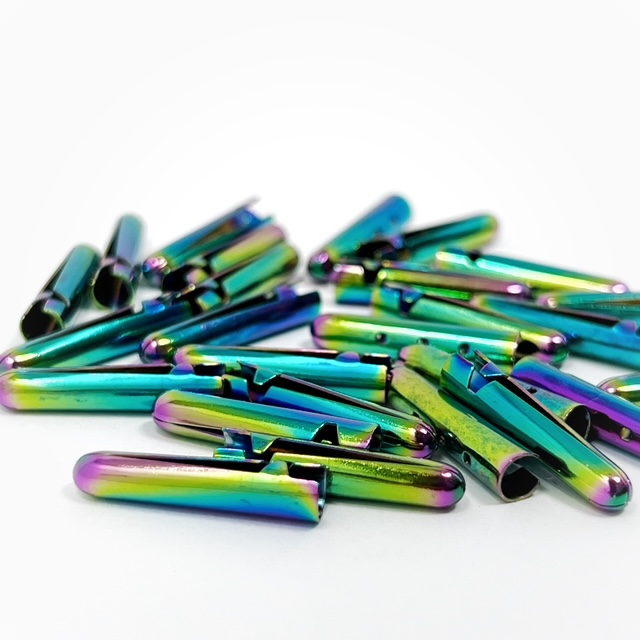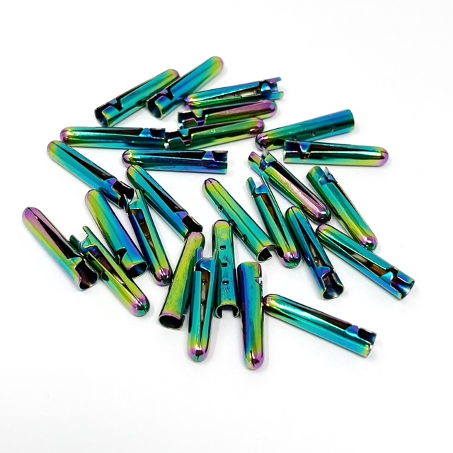 AG20-r 20mm x 3.7mm, rainbow metal aglets, 100 pieces per pack. These metal ends work perfectly with 2 dookkii products as shown here: DC4 cord & DCS8 drawstring tape. Easy to attachwith pliers, tape & scissors
