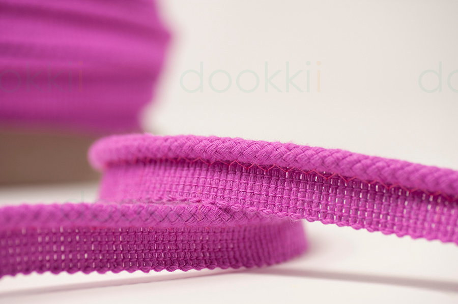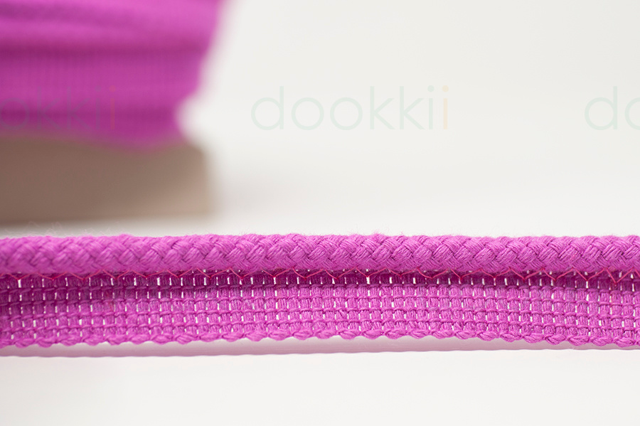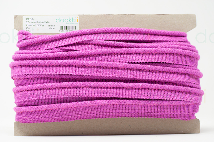 dcf8, 23mm flanged piping cord, mainly used to edge cushions. Made from 50% cotton, 50% acrylic yarn, it has a contemporary matte finish, 20m per card. Made in England. Colour 19 – cyclamen, 20 metres per card