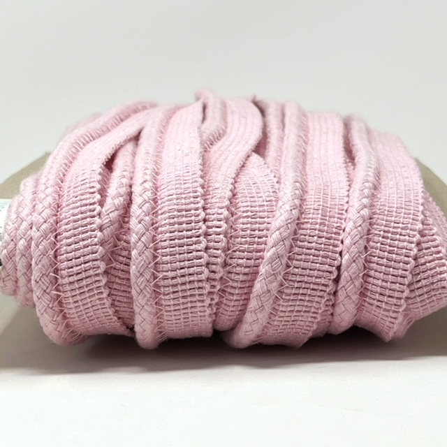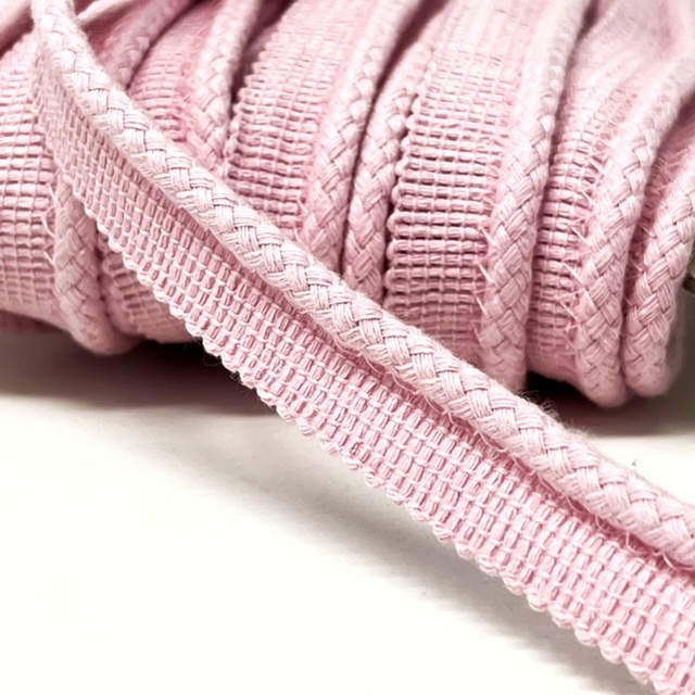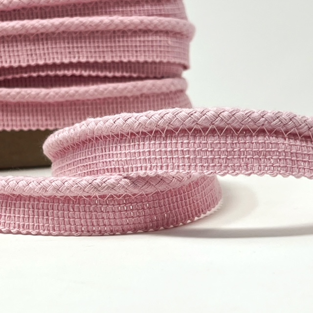 dcf8, 23mm flanged piping cord, mainly used to edge cushions. Made from 50% cotton, 50% acrylic yarn, it has a contemporary matte finish, 20m per card. Made in England. Colour 20 – sweet pink, 20 metres per card