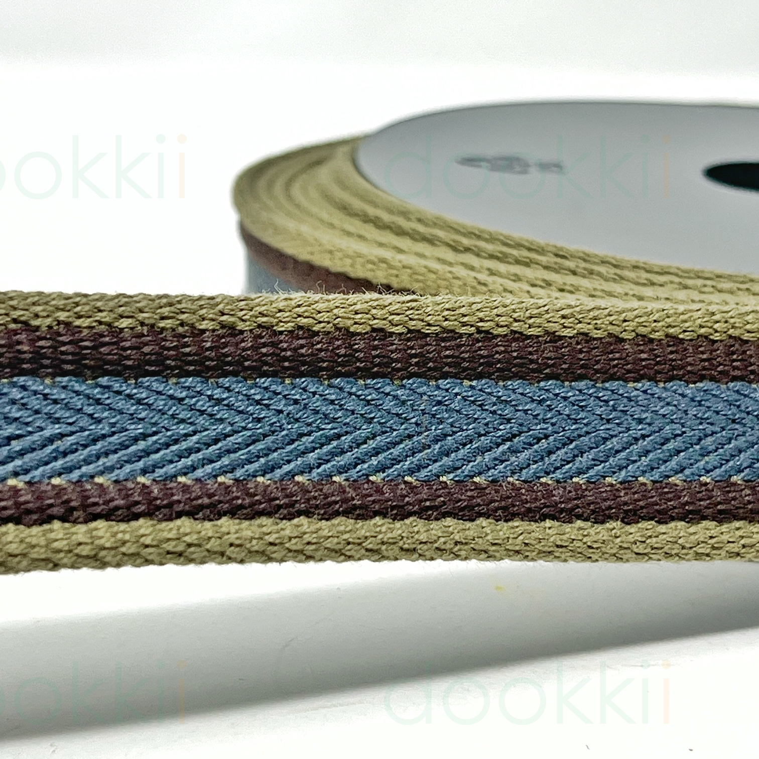 dw1989-43 varsity stripe cotton mix webbing 30mm, denim/brown/khaki, 10m per roll
