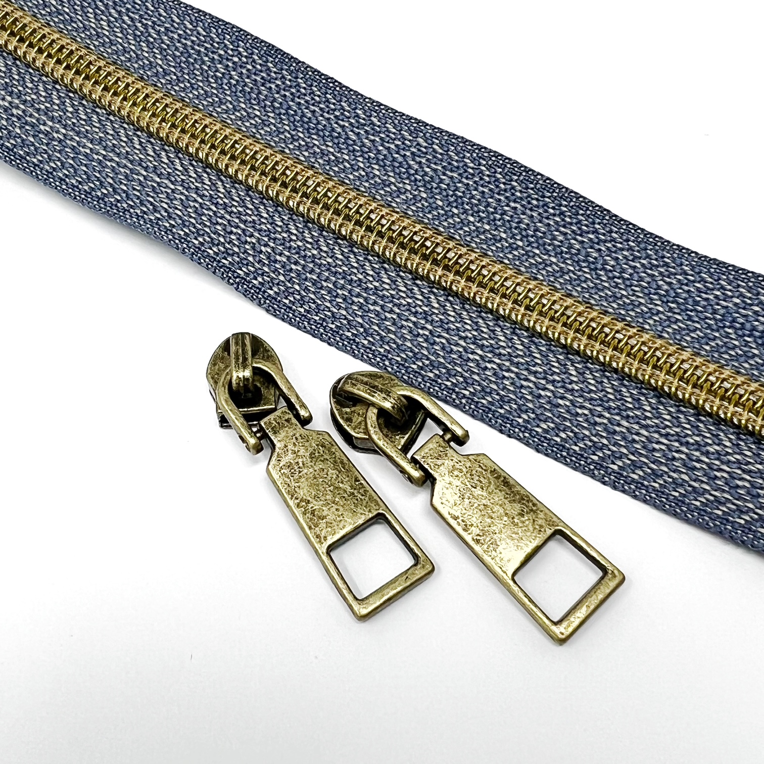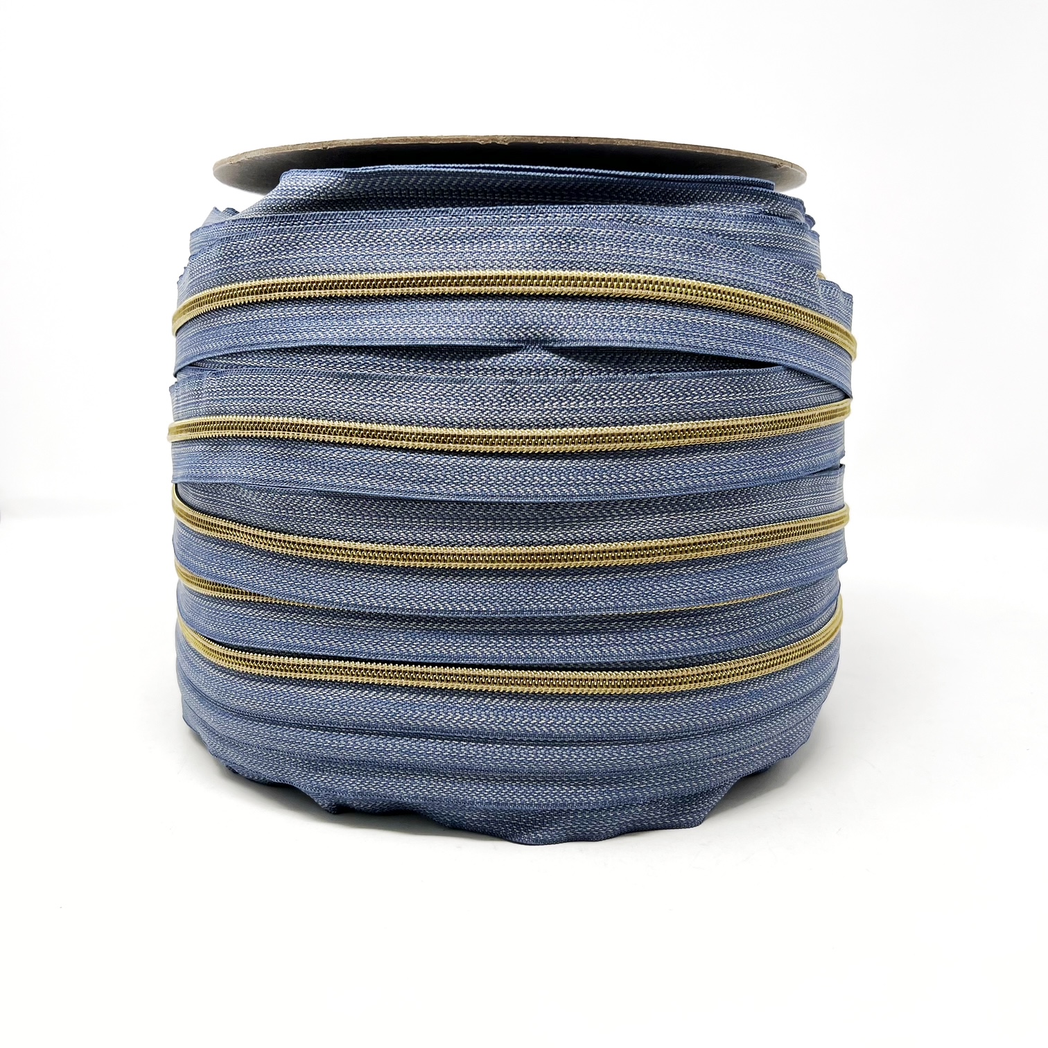 s7-100con-denim/antique brass – no.5 (6mm) deluxe continuous zip with nylon teeth, 100 metres per roll. Use with any of our ZS7 metal sliders