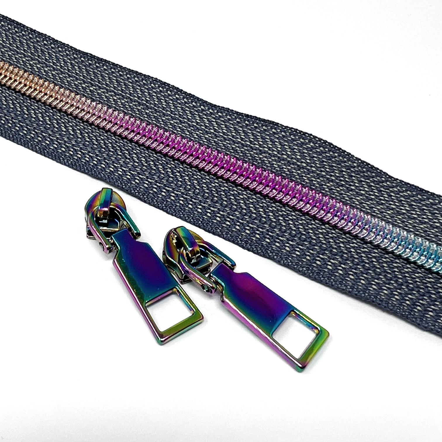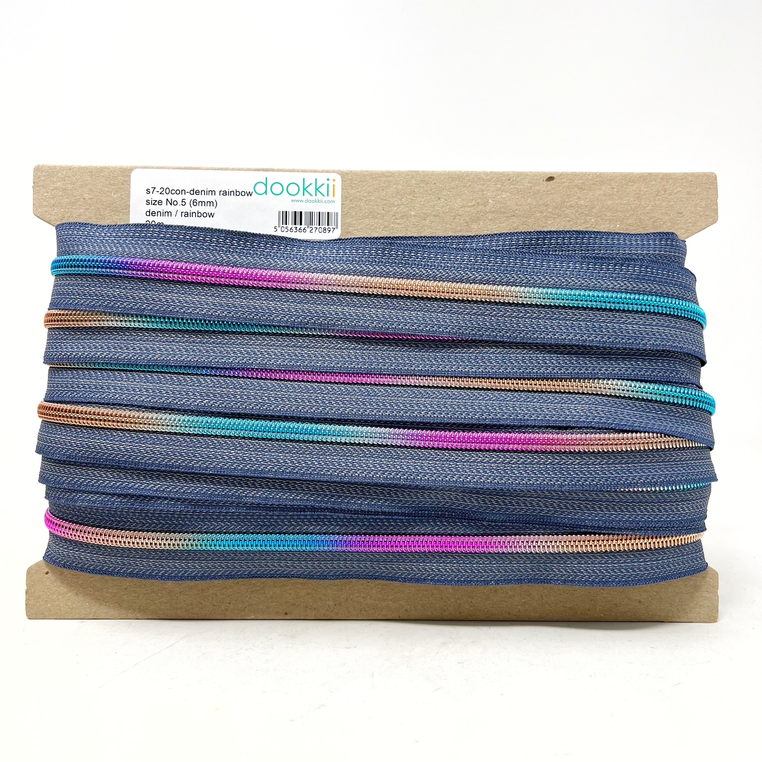 s7-20con-denim/rainbow – no.5 (6mm) deluxe continuous zip with nylon teeth, 20 metres per card. Use with any of our ZS7 metal sliders
